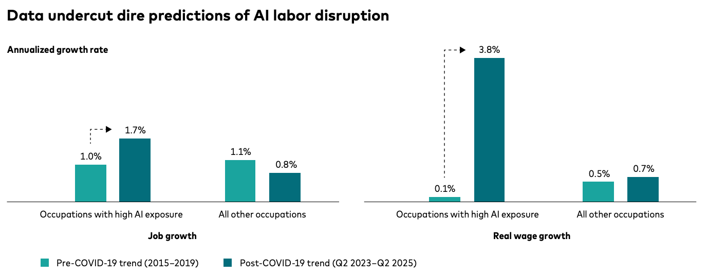 The Vanguard study shows that jobs with AI exposure are growing the most. Occupations with high AI exposure had a 1.7% job growth and a 3.8% real wage growth, greater than the growth before generative AI.