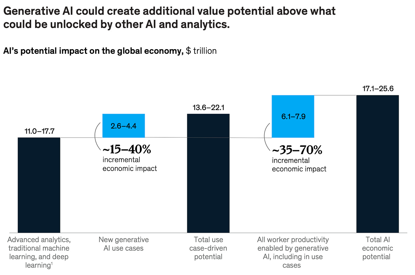 A report from McKinsey estimates the total AI economic potential to be between $17.1 to $25.6 trillion.